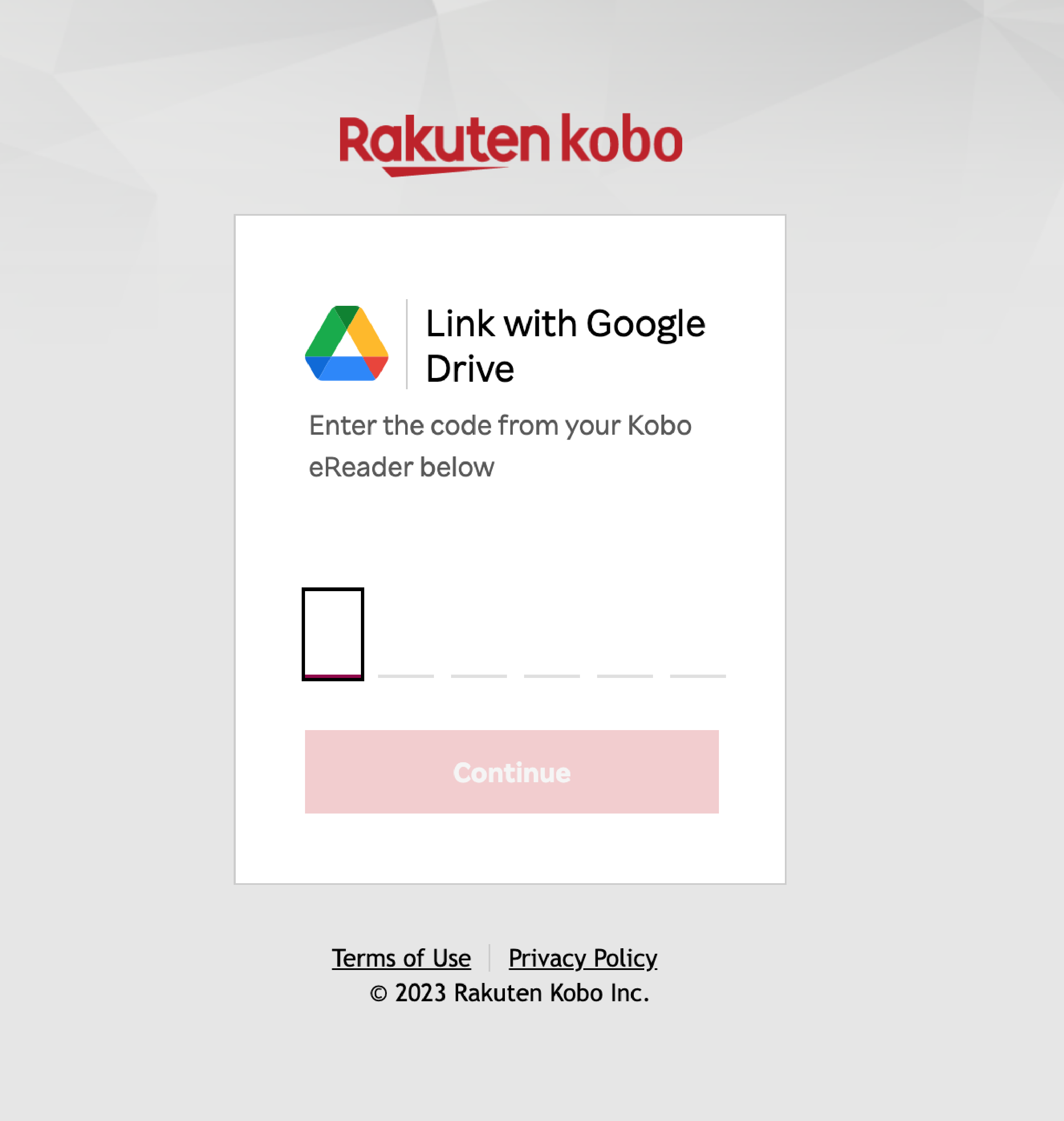 Nachdem du den Code, den du auf deinem eReader siehst, auf der Kobo-Website eingegeben hast, wird dein eReader-Konto mit deinem Kobo-Konto verknüpft. Wenn dein eReader und dein Google-Konto verknüpft sind, kann dein eReader auf Dateien zugreifen, die du in Google Drive hochgeladen hast.