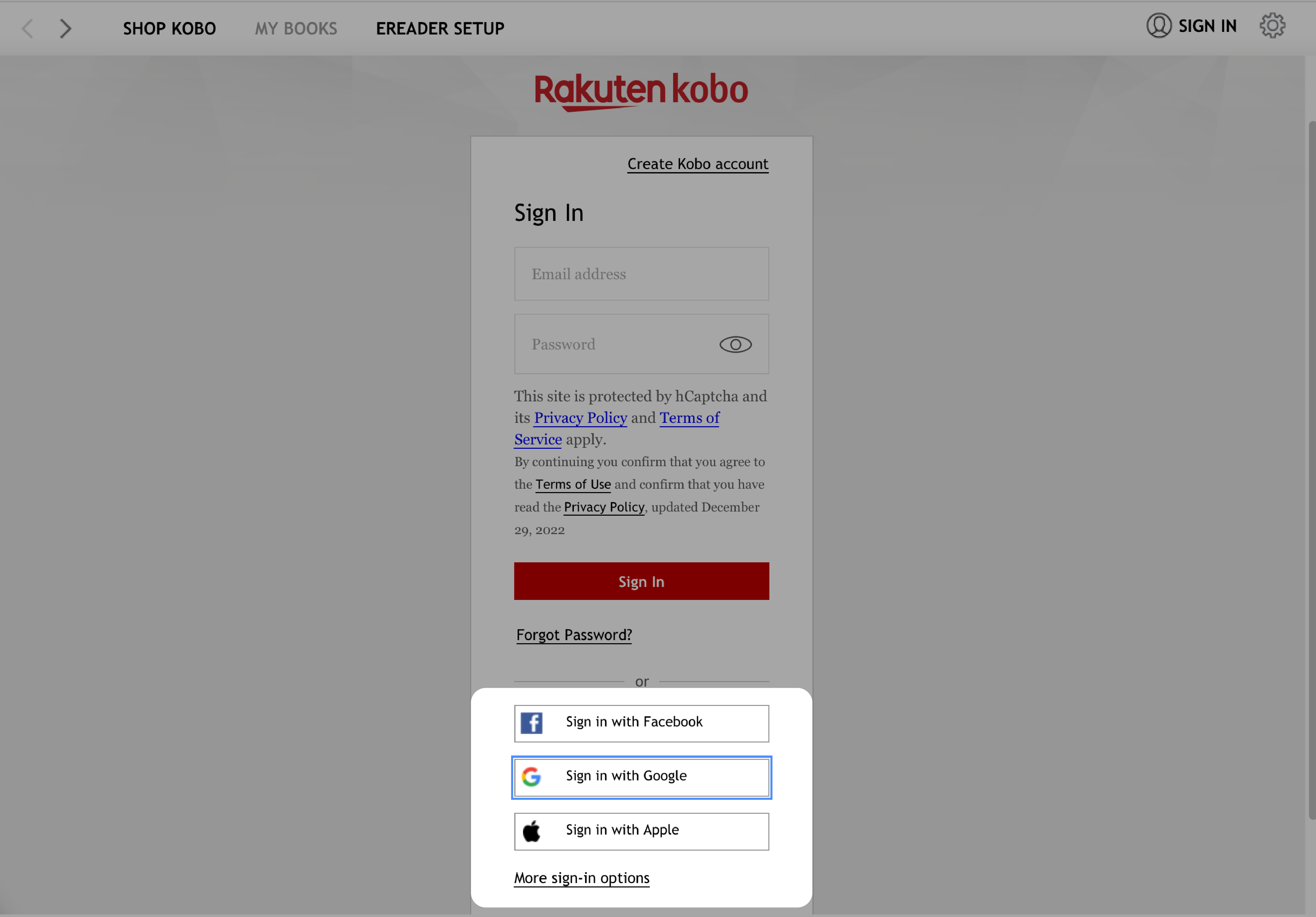 Sie können sich auch mit Ihren Facebook- oder Google-Kontoinformationen oder mit Ihrem Benutzernamen und Passwort von einem der Kobo-Partner anmelden.