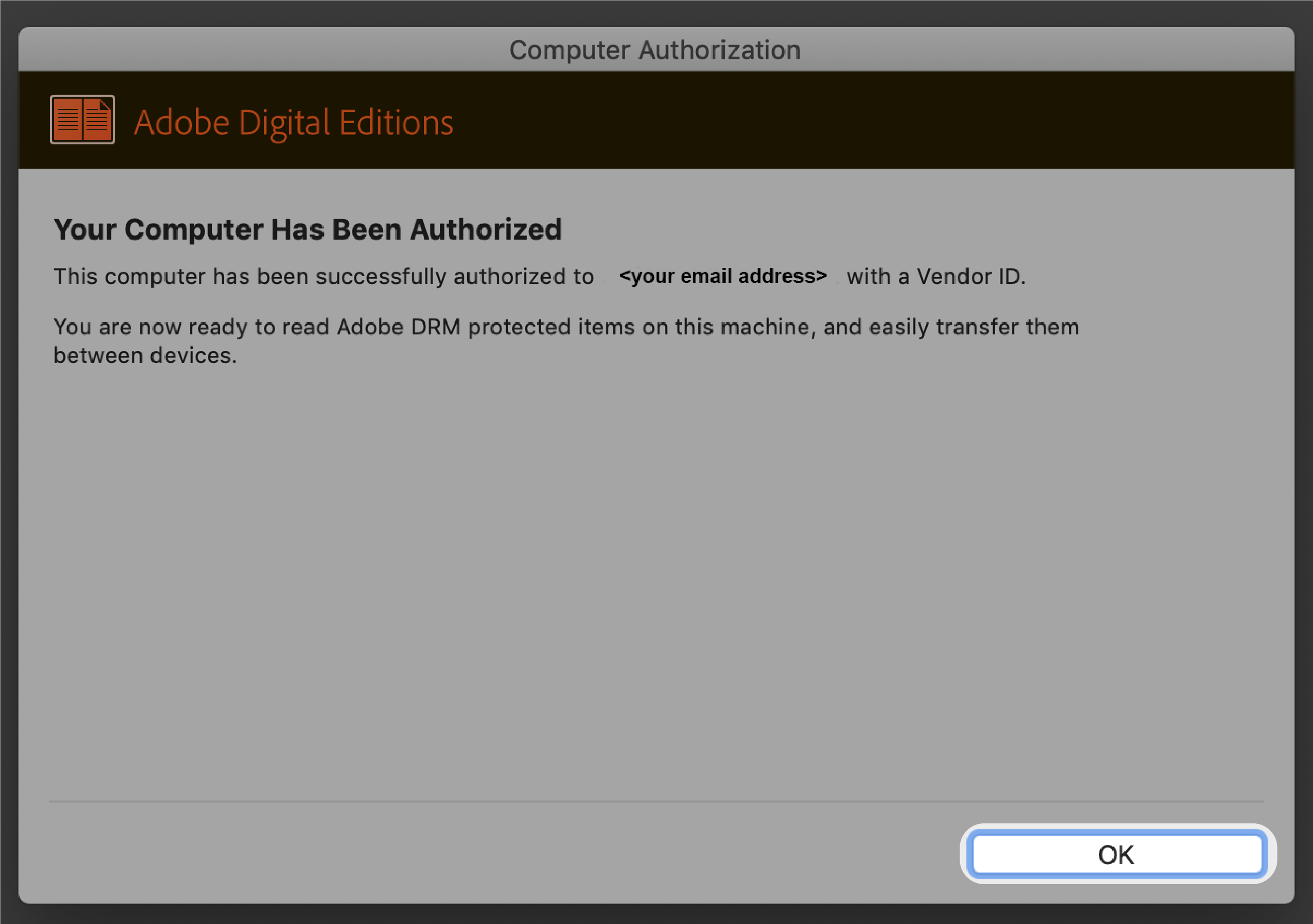 Kun olet asentanut Adobe Digital Editionsin (ADE) ja luonut Adobe-tunnuksen, sinun on valtuutettava tietokoneesi ADE:n kanssa. Sinun tarvitsee tehdä tämä vain kerran.