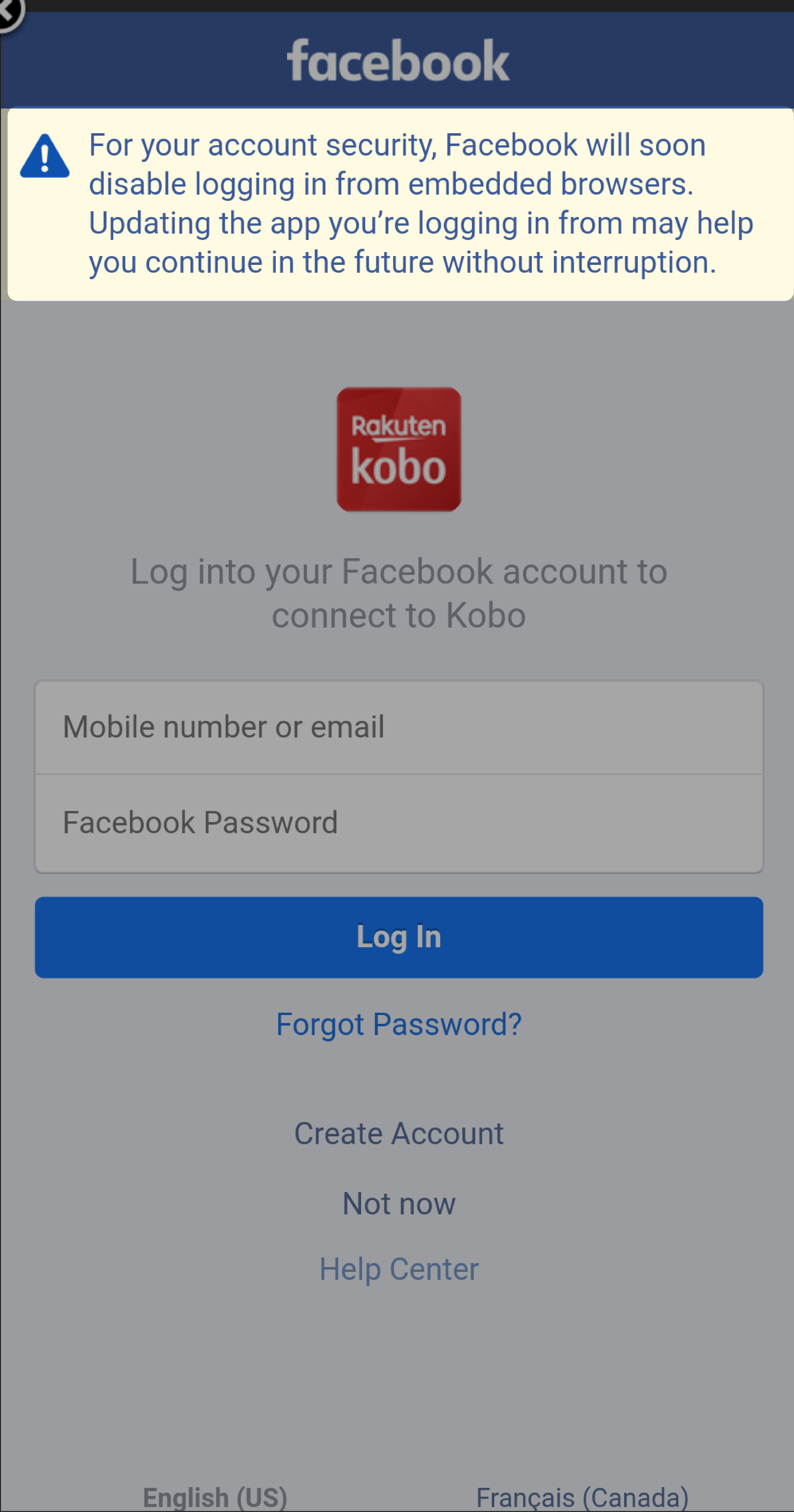Se estiver a utilizar uma versão mais antiga da aplicação Kobo Books para Android, verá uma mensagem de erro se tentar iniciar sessão na aplicação Kobo Books utilizando a sua conta do Facebook.