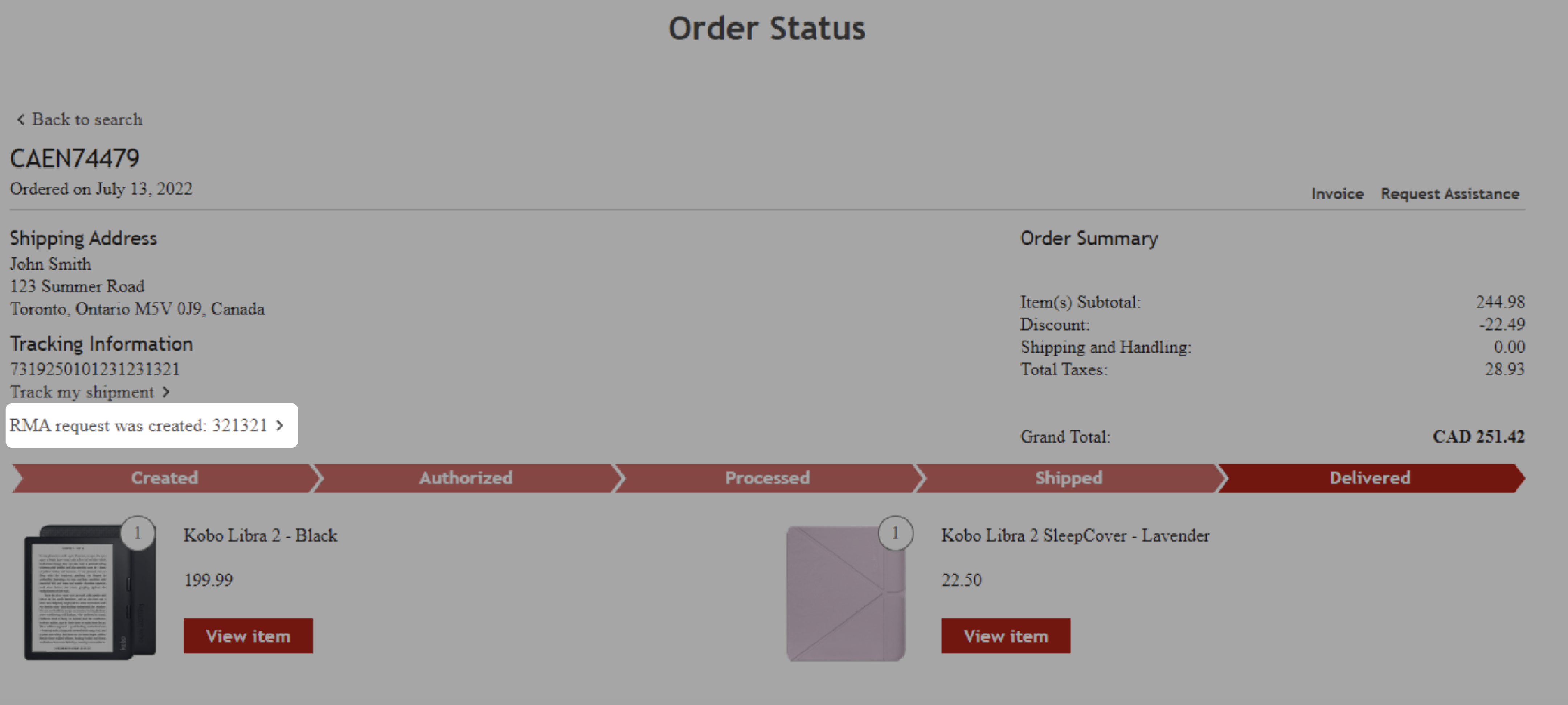 Será criado um pedido de devolução e verá um resumo do seu estado de devolução.