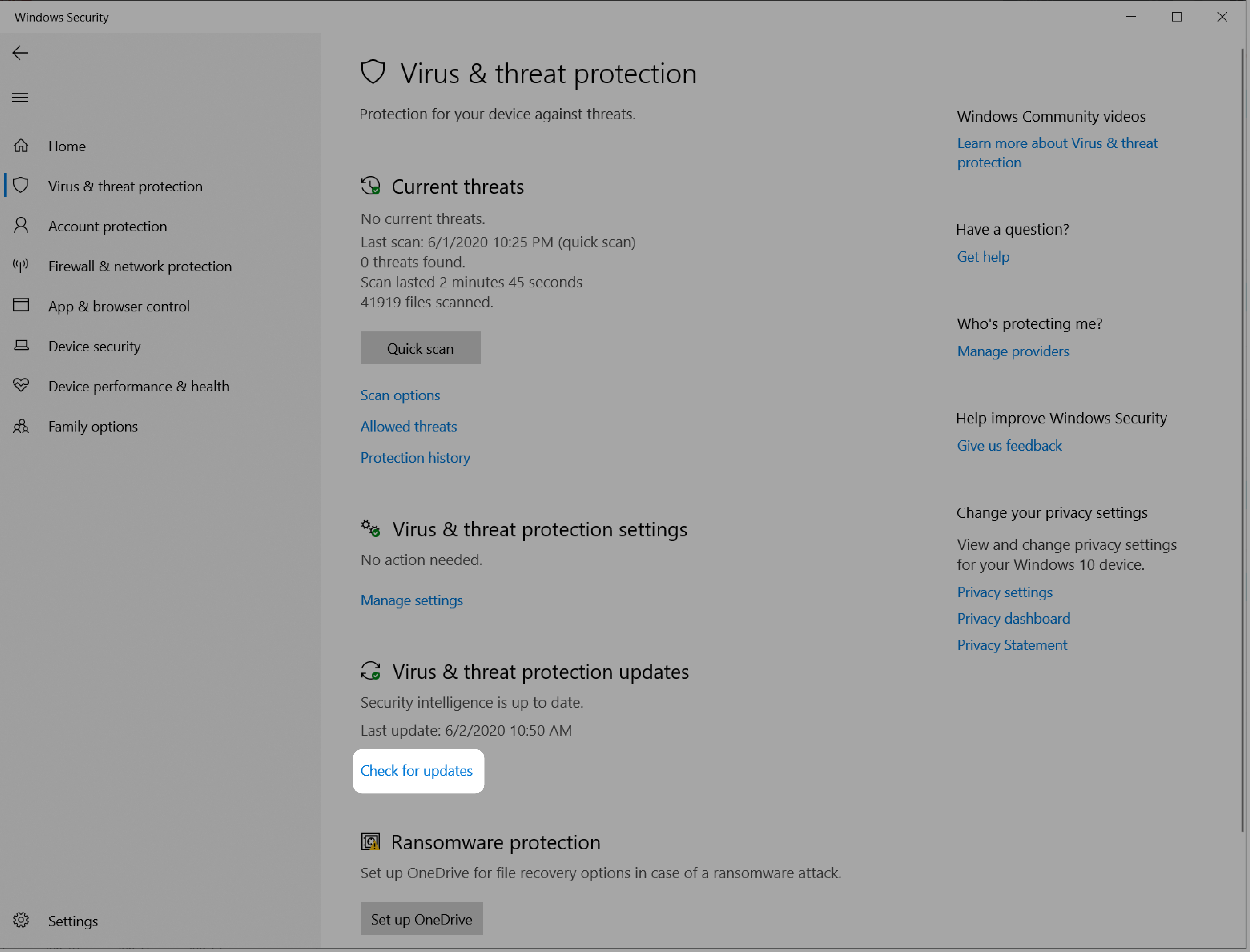 - Klicka på sök efter uppdateringar i delen för uppdatering av virus & skydd mot hot.