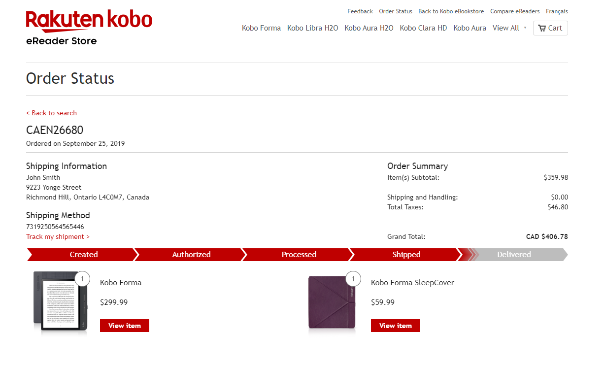 Bir Kobo eOkuyucu veya aksesuar satın aldıktan sonra, siparişin durumunu kontrol edebilirsiniz.