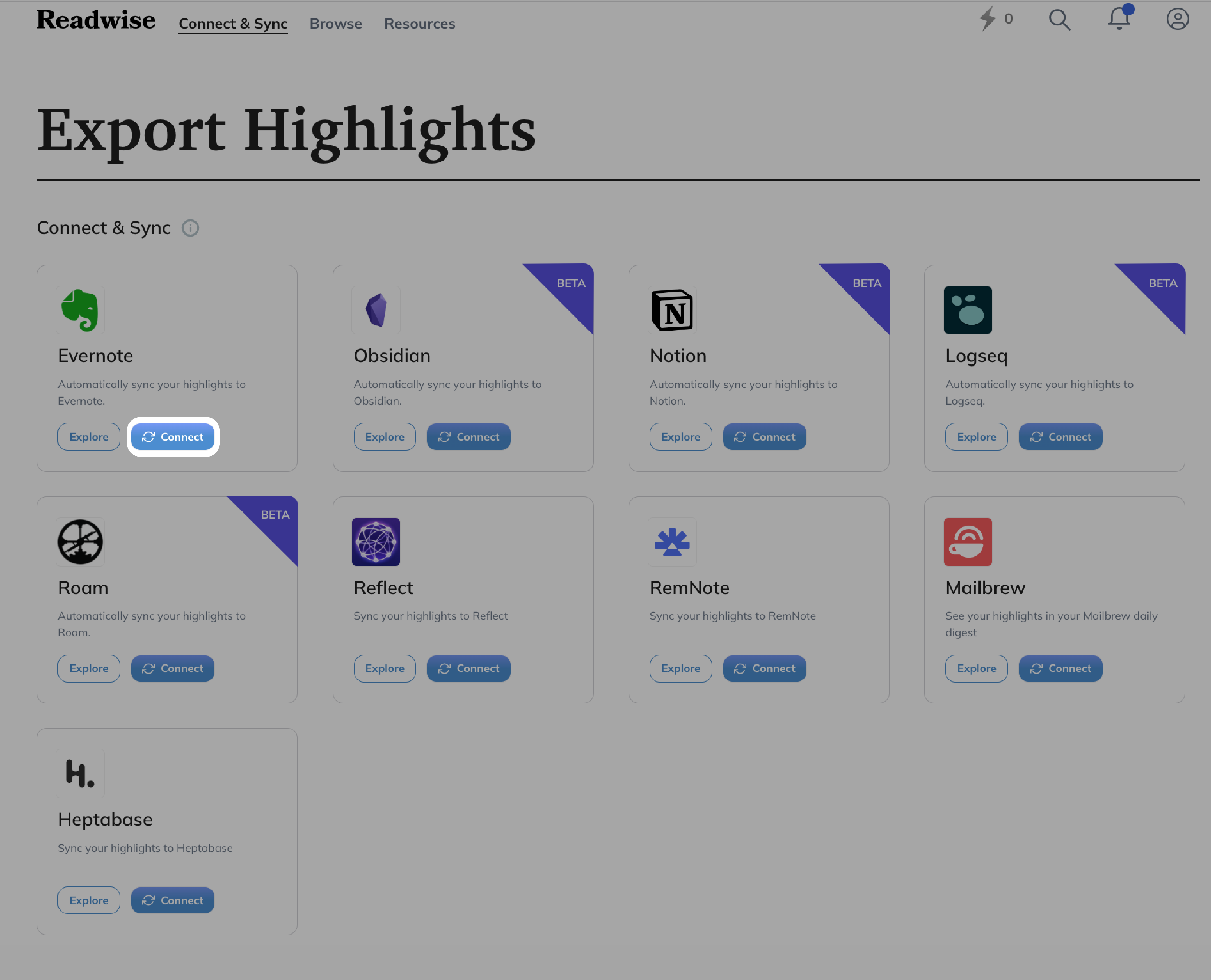 透過 Readwise 可連接至其他服務以儲存附註。例如,可以將 Readwise 附註匯出到 Evernote、Notion 等。