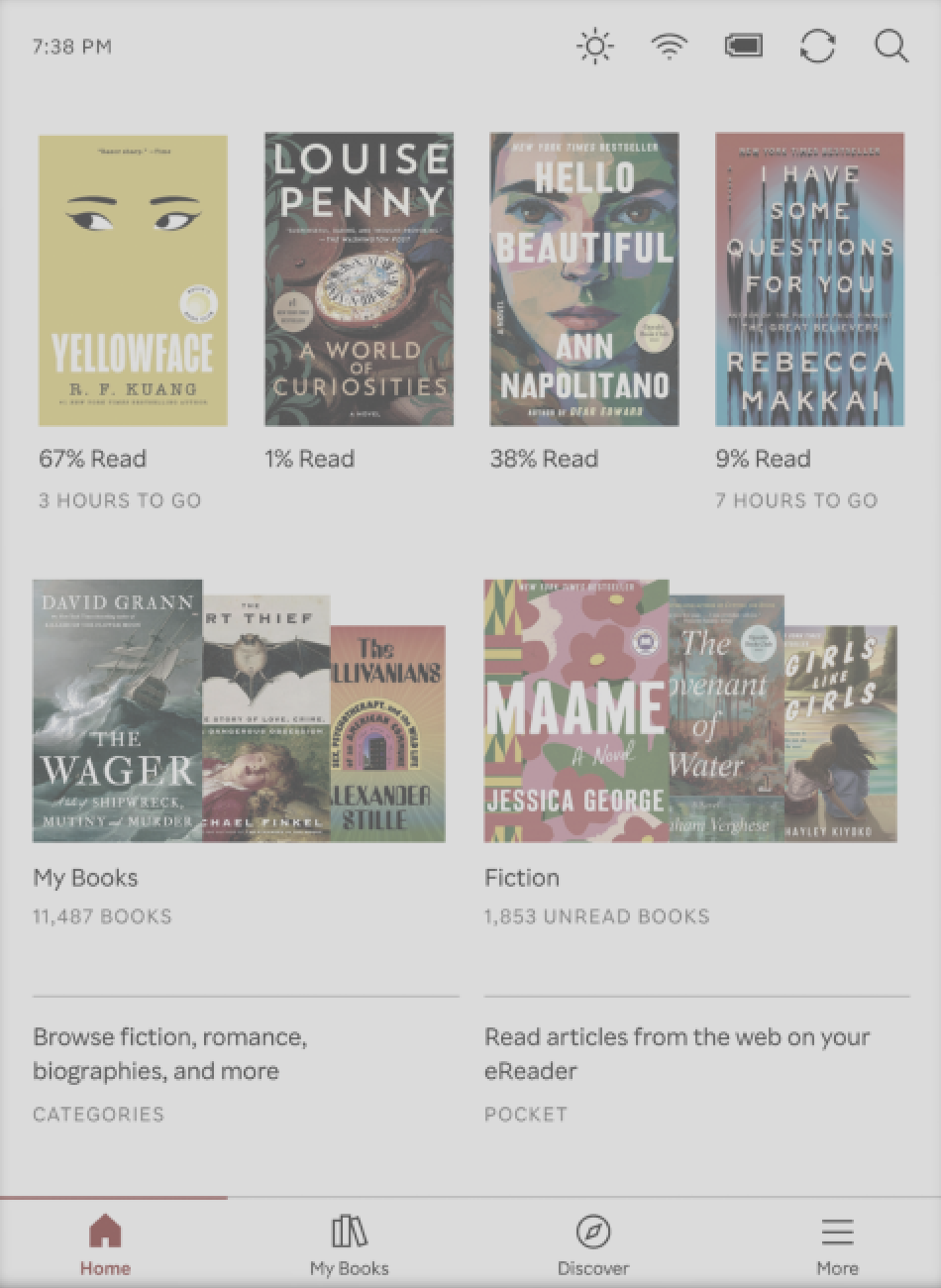 瀏覽主畫面或「我的書籍」功能表時,所有書籍都將顯示彩色封面。關閉 eReader 或將其置於休眠模式時,書籍也將顯示彩色封面。